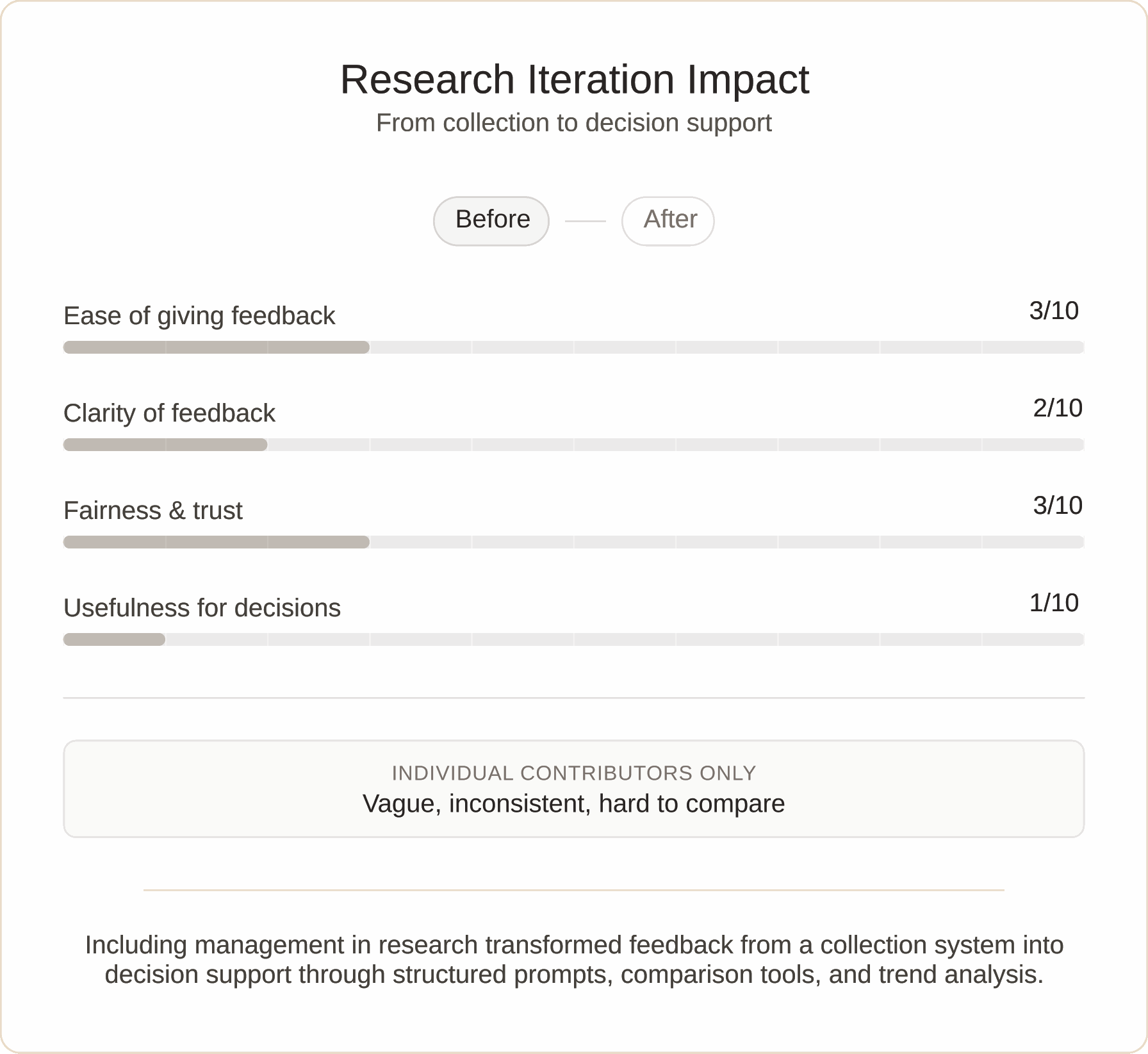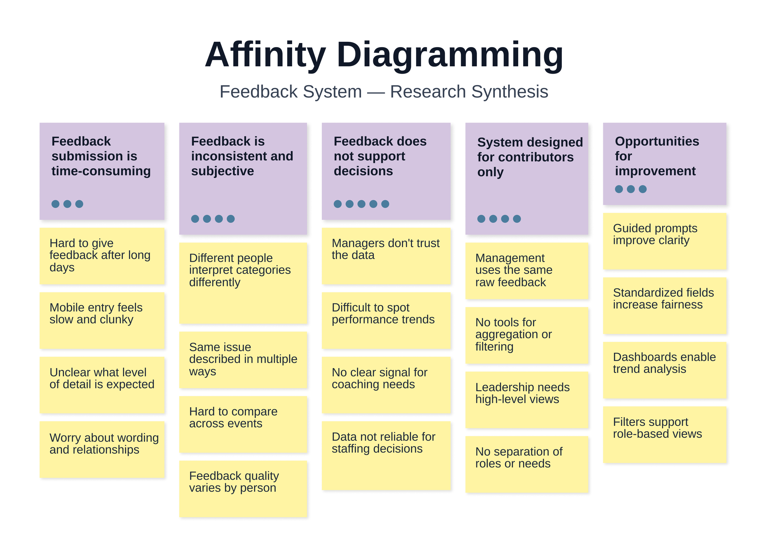 Affinity diagramming revealed that the core issue was not feedback submission alone, but the system's inability to support comparison and decision-making across roles. These insights directly informed structured prompts, role-based views, and management dashboards.