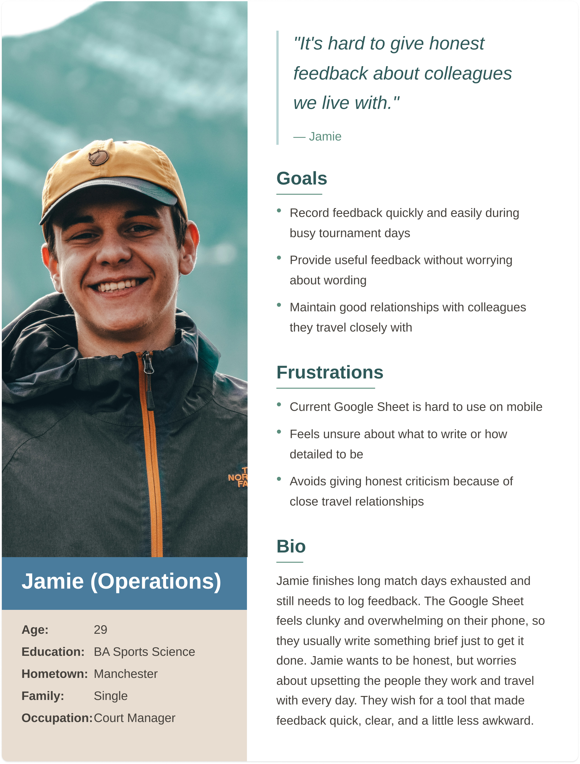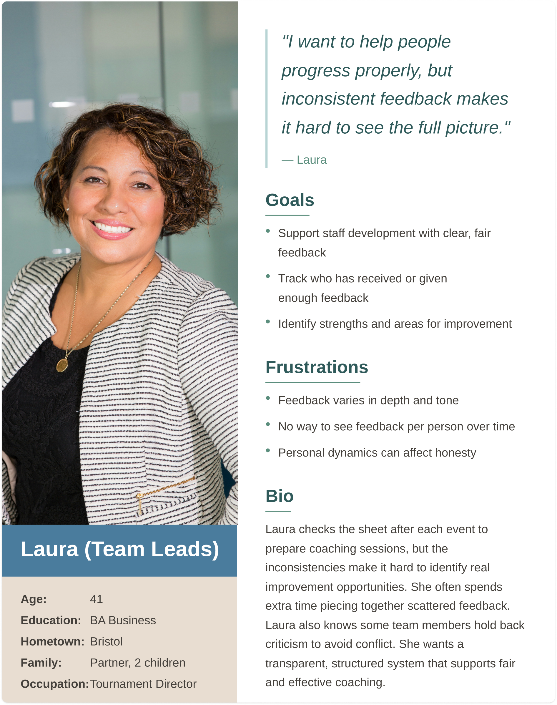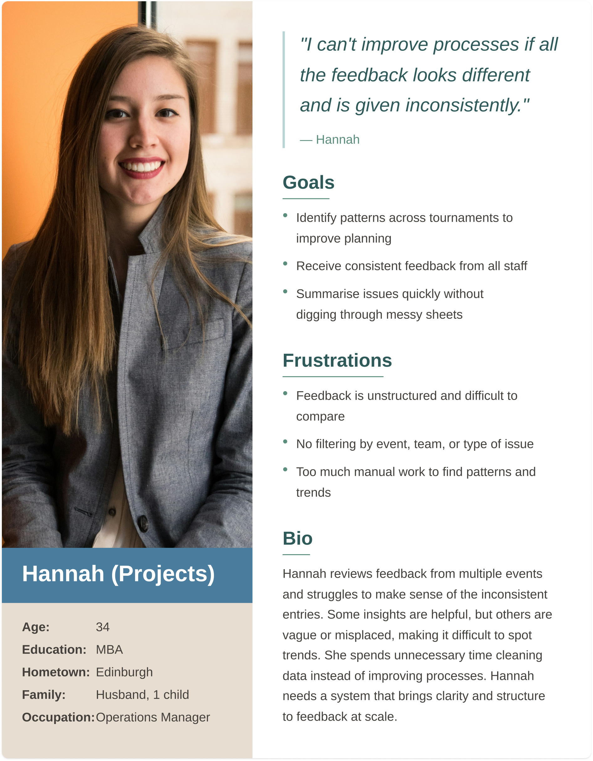Projects staff oversee multiple tournaments, so they need structured, high-level feedback showing trends and supporting process, planning, and communication improvements.