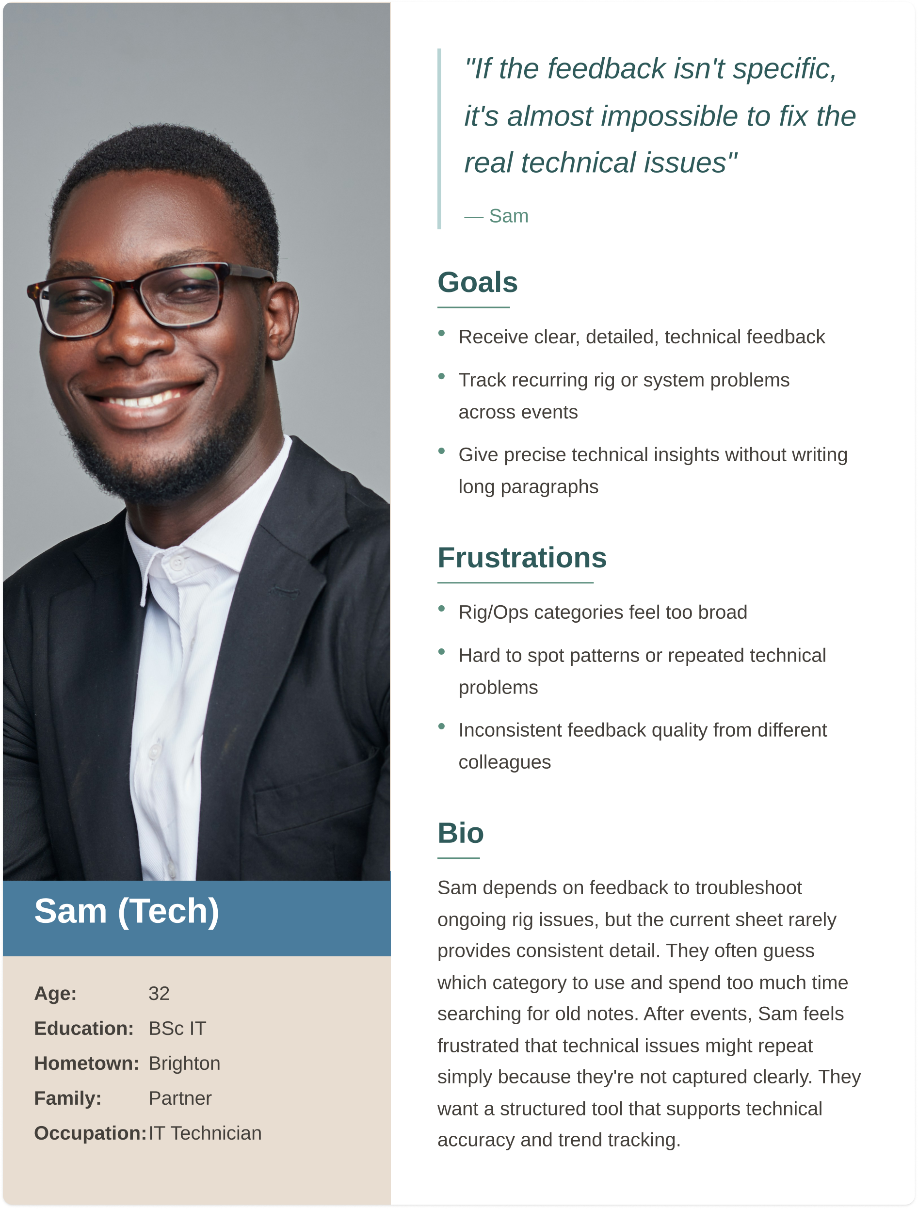 I conducted qualitative and quantitative research through interviews with operations staff, technicians, project coordinators, and team leads. Initially, I assumed the main issue was form usability. Research revealed deeper challenges around emotional safety, time pressure, lack of structure, and the inability to use feedback meaningfully after submission.