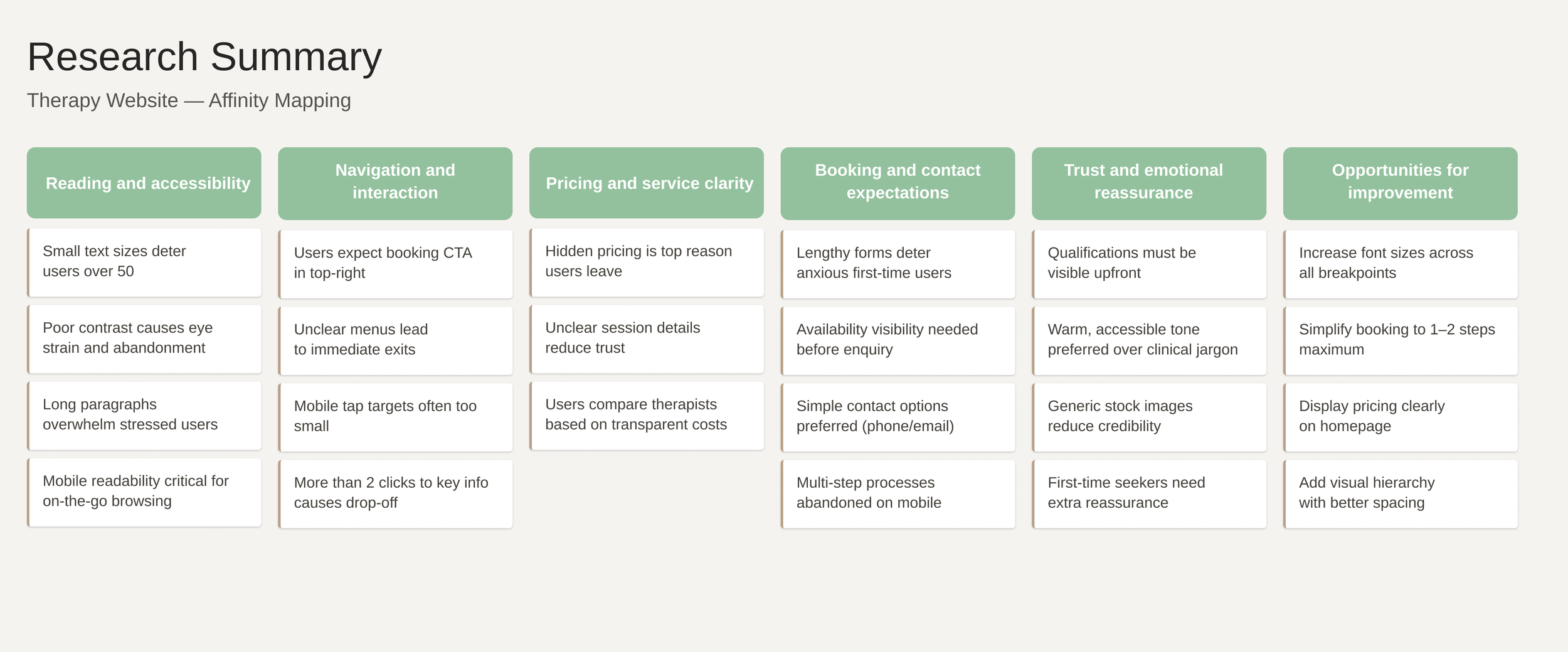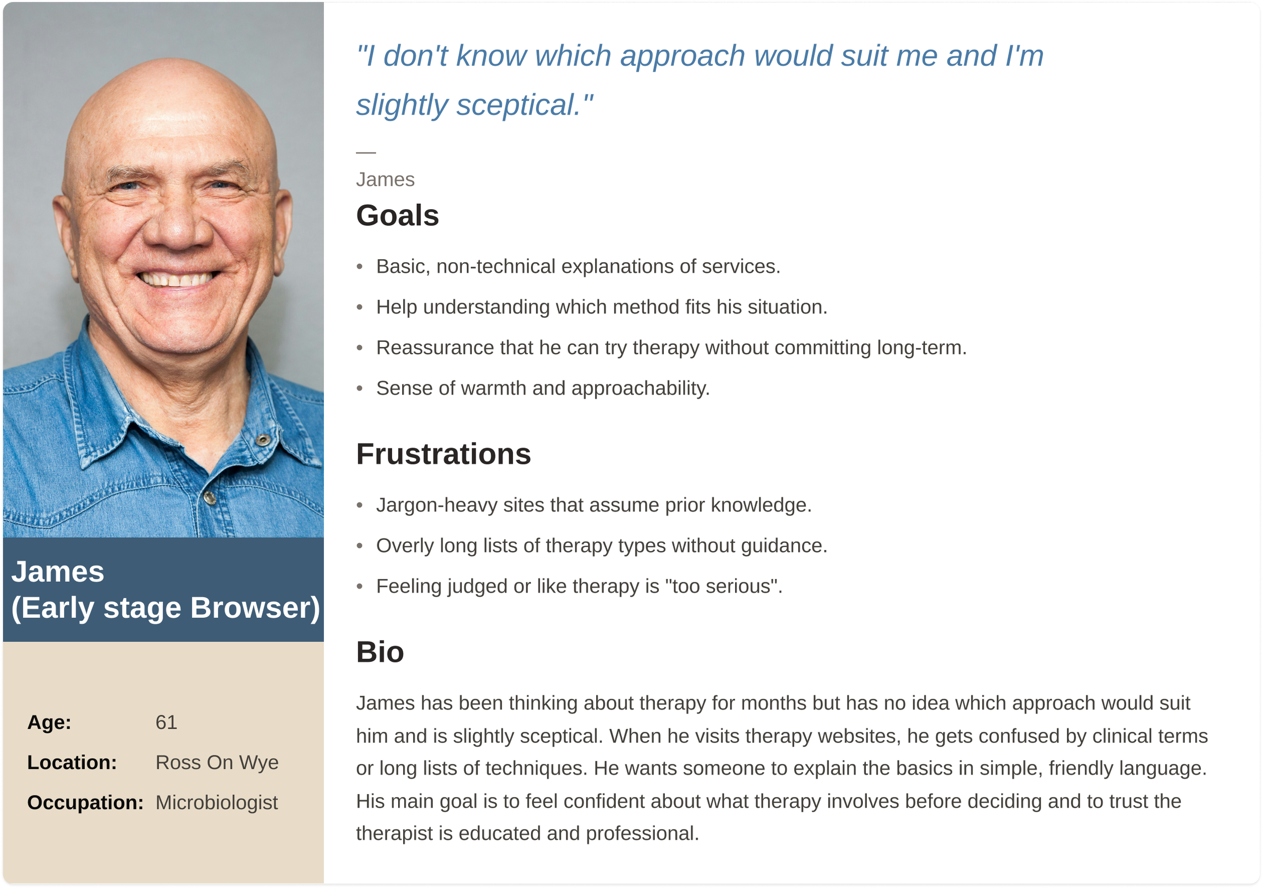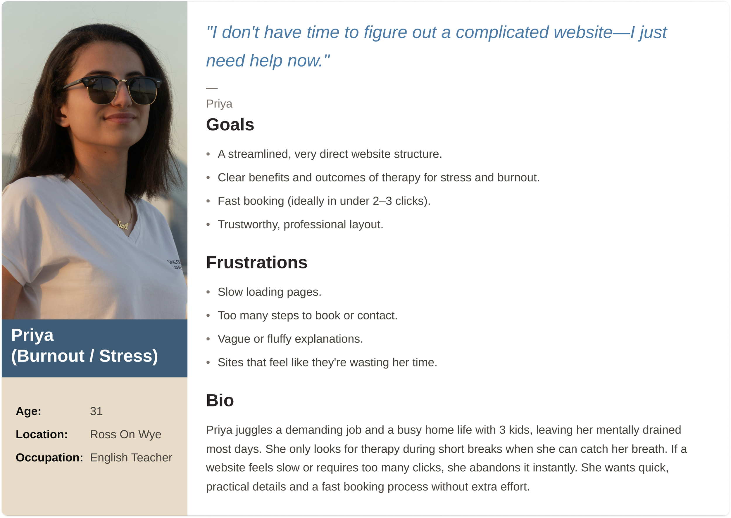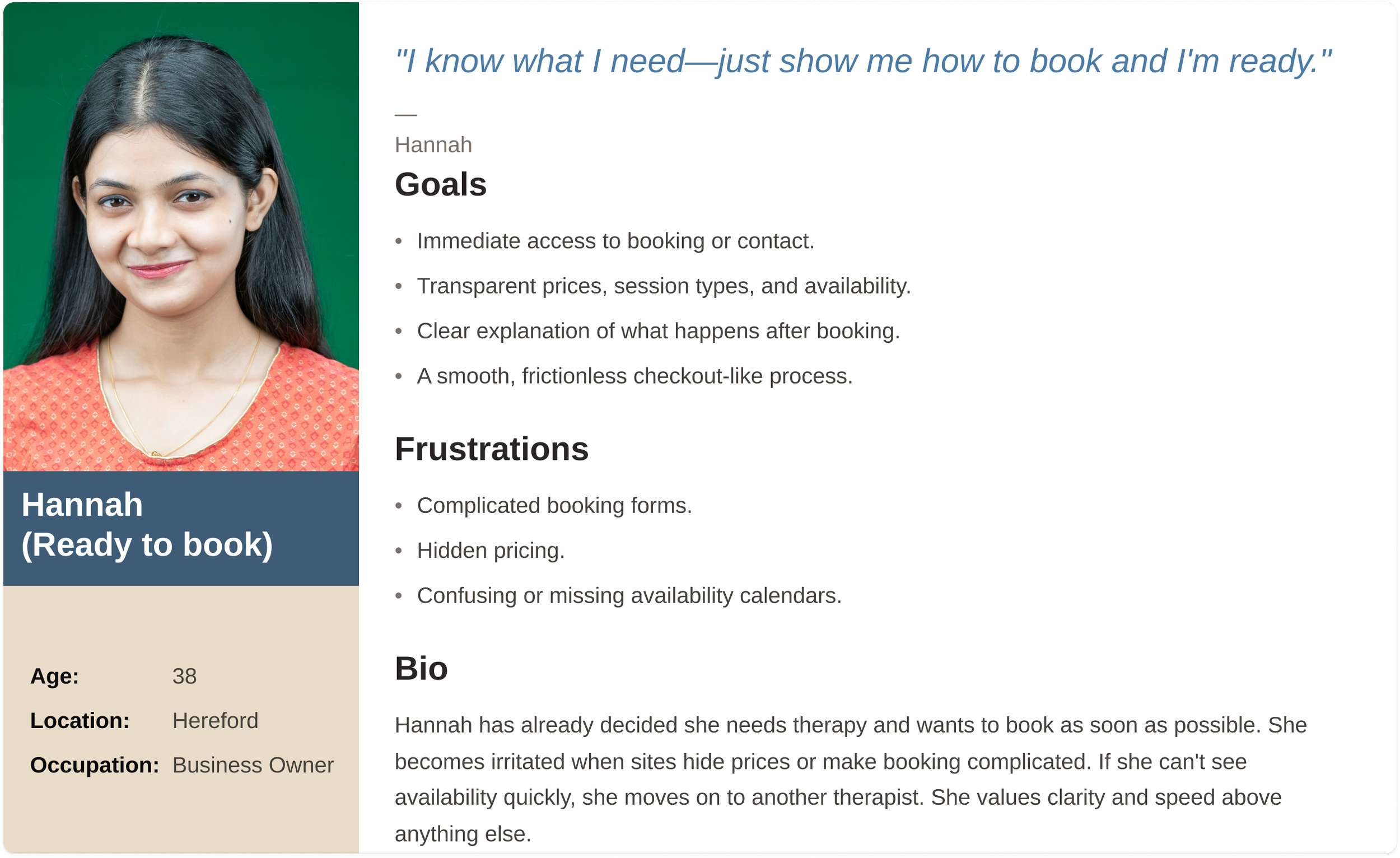 Some users were seeking trauma-informed support and prioritised safety, reassurance, and trust. Others experienced anxiety or overthinking and felt overwhelmed by long paragraphs or too many options. Users experiencing burnout valued direct explanations and minimal steps. Early-stage browsers needed clear, non-technical guidance before committing. Ready-to-book users wanted fast access to pricing, availability, and contact details. Past or current clients highlighted friction based on real booking experiences.
