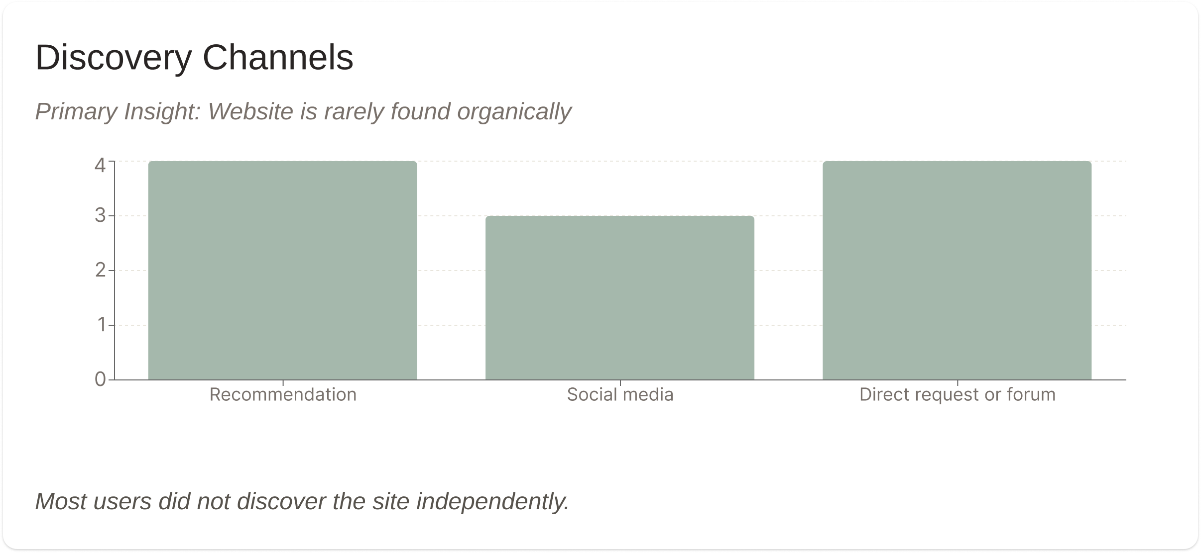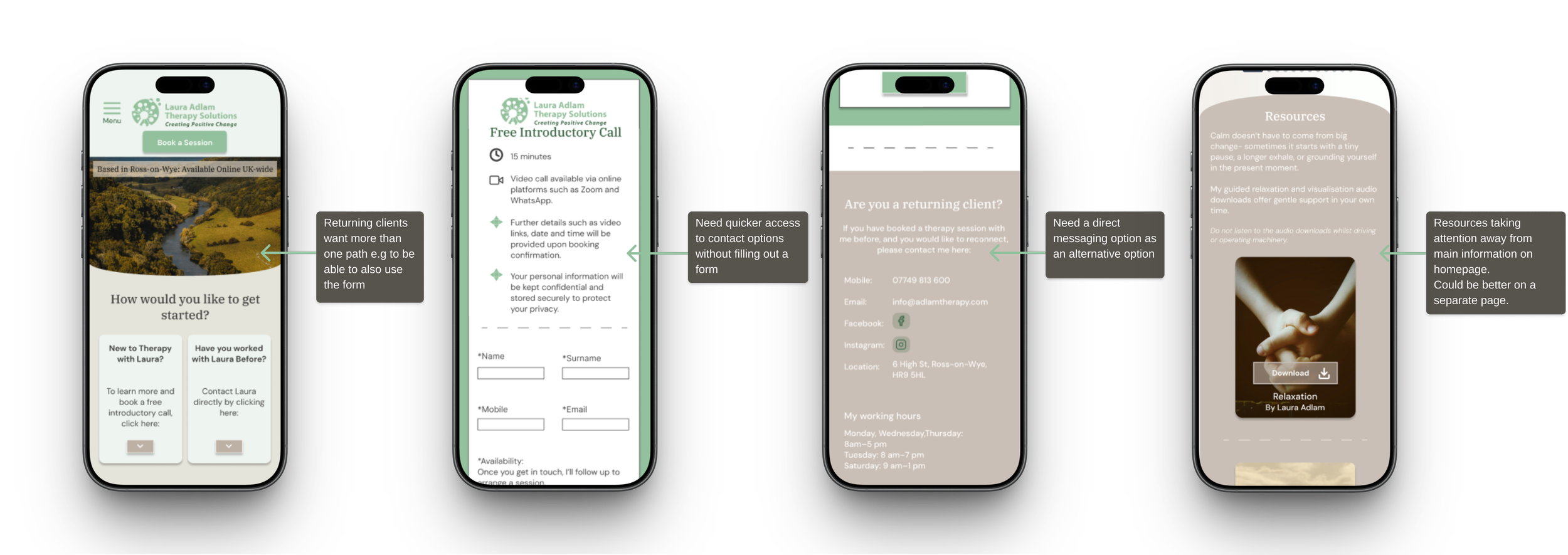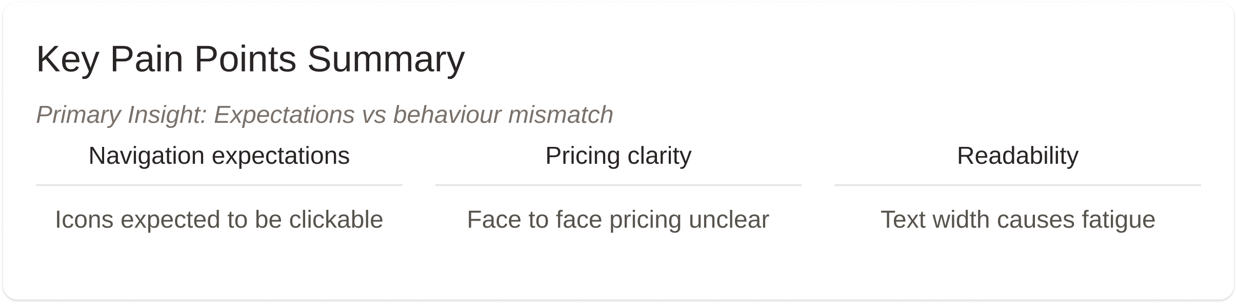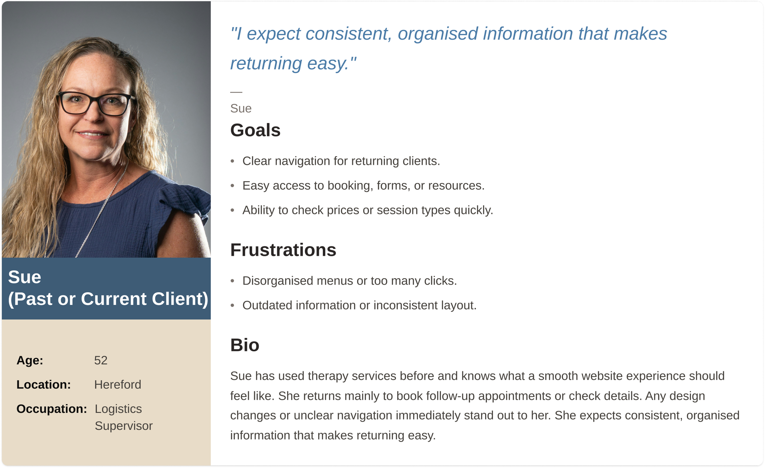 Some users were seeking trauma-informed support and prioritised safety, reassurance, and trust. Others experienced anxiety or overthinking and felt overwhelmed by long paragraphs or too many options. Users experiencing burnout valued direct explanations and minimal steps. Early-stage browsers needed clear, non-technical guidance before committing. Ready-to-book users wanted fast access to pricing, availability, and contact details. Past or current clients highlighted friction based on real booking experiences.