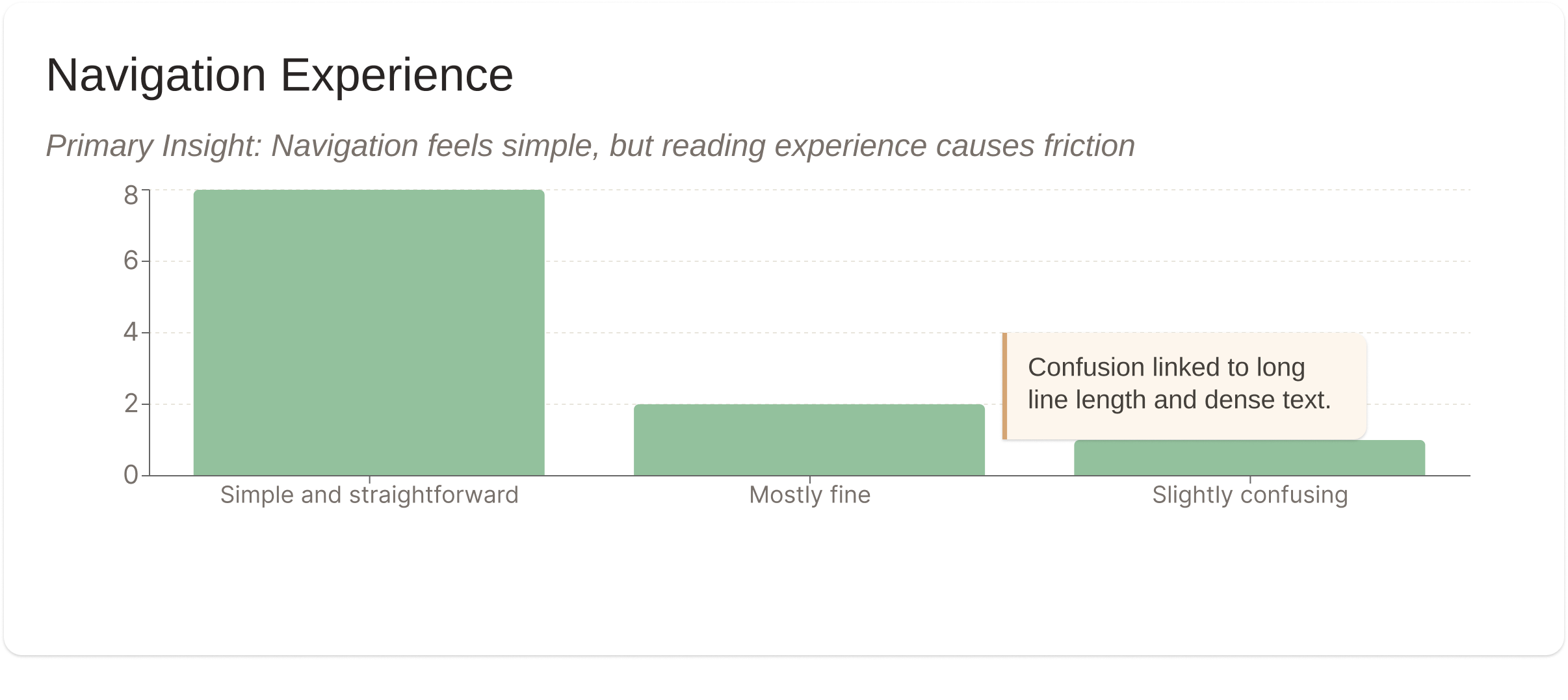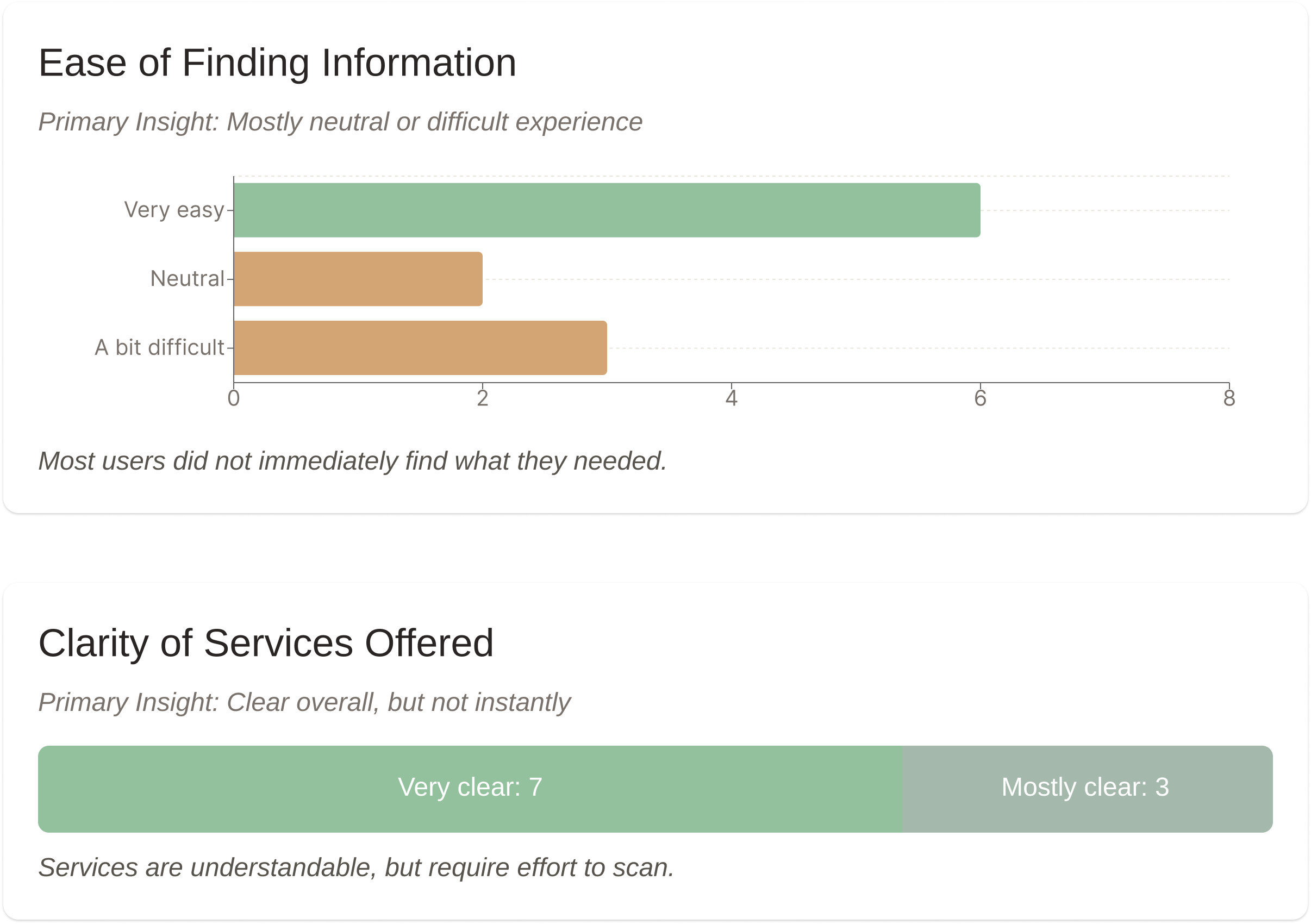 I conducted qualitative interviews and a usability survey with participants representing different therapy-seeking stages. While users generally described the site as calm and easy to navigate, research revealed consistent challenges around information clarity, trust signals, and booking confidence.