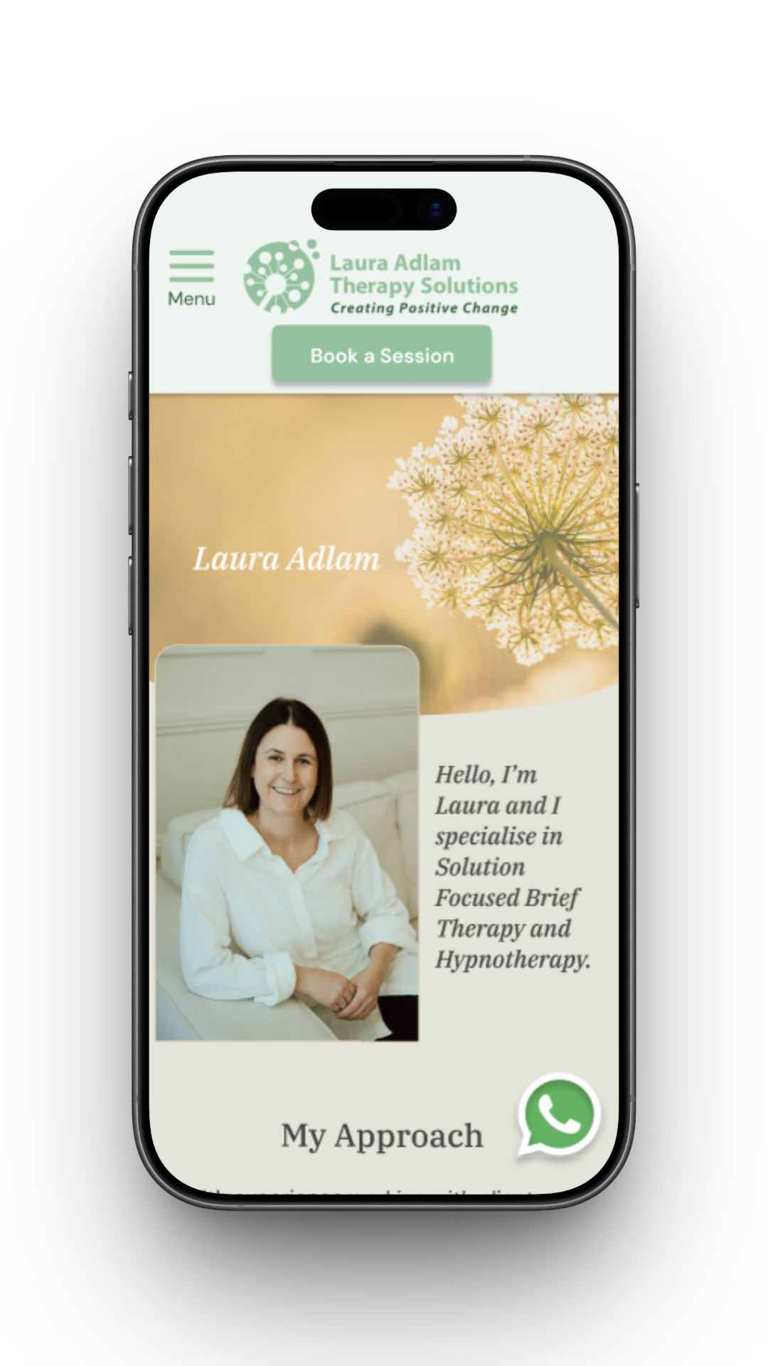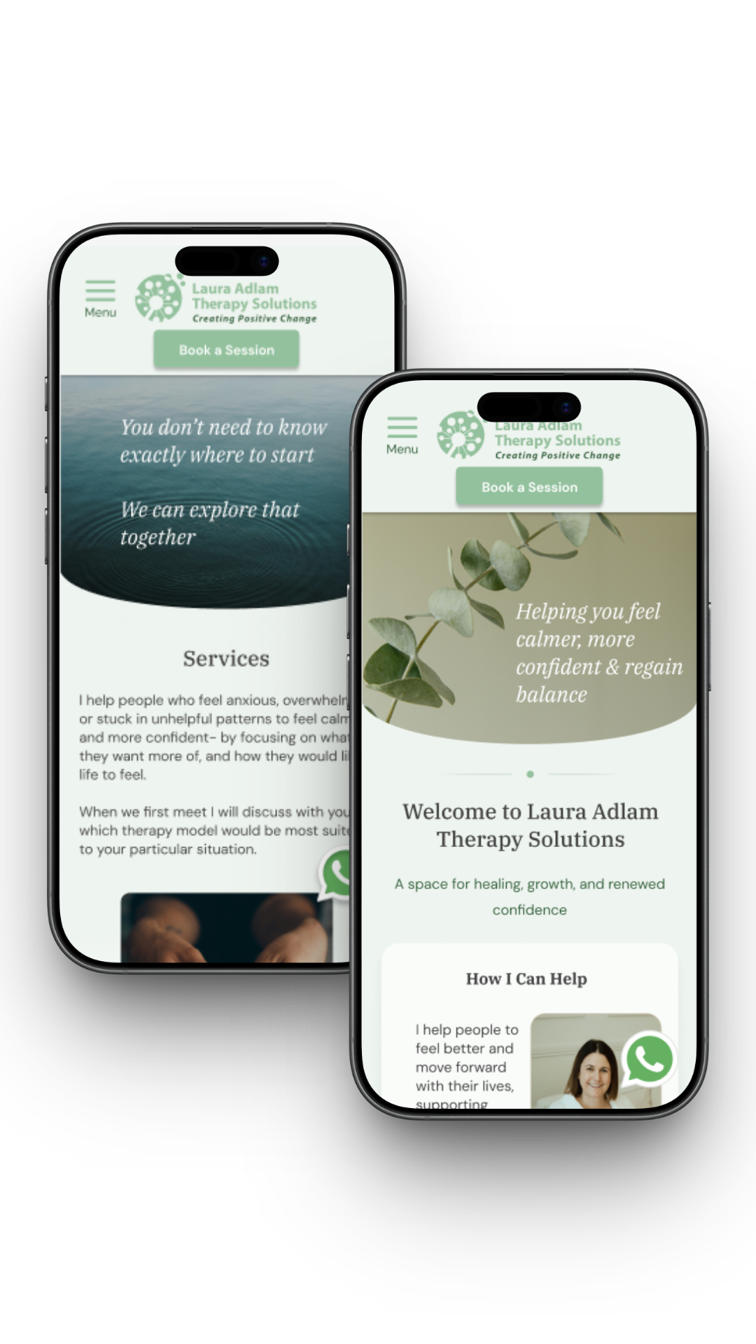 A personal website for an independent therapist, Laura Adlam, designed to help current and potential clients access information about therapy services, understand what to expect, find supportive resources, and contact Laura easily to book a session.