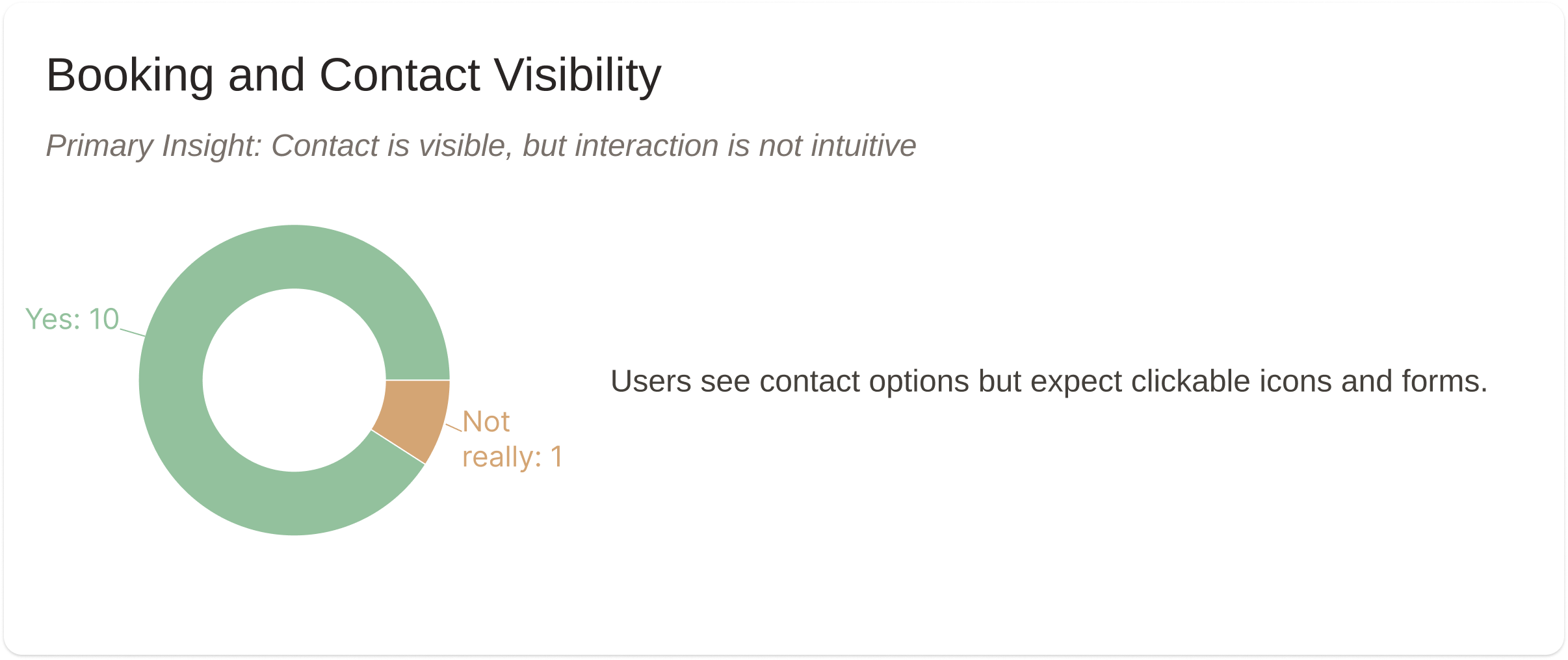 Participants were generally able to navigate the site and complete tasks, but testing surfaced specific opportunities to further reduce friction and hesitation before booking.